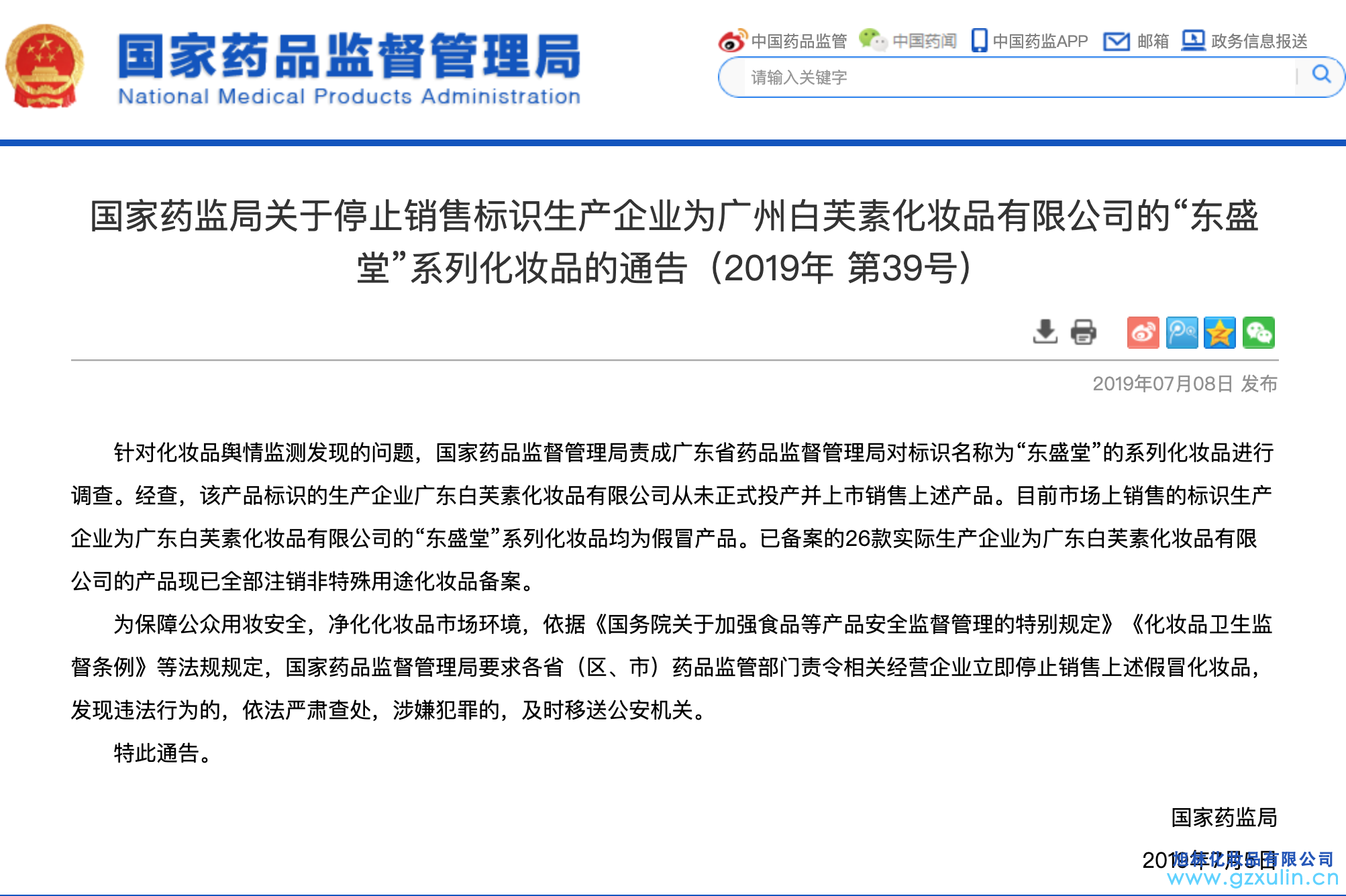 針對化妝品輿情監測發現的問題,國家藥品監督管理局責成廣東省藥品監督管理局對標識名稱為“東盛堂”的系列化妝品進行調查。經查,該產品標識的生產企業廣東白芙素化妝品有限公司從未正式投產并上市銷售上述產品。目前市場上銷售的標識生產企業為廣東白芙素化妝品有限公司的“東盛堂”系列化妝品均為假冒產品。已備案的26款實際生產企業為廣東白芙素化妝品有限公司的產品現已全部注銷非特殊用途化妝品備案。